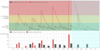 Ensimmäinen kierros meni aika kevyttä vauhtia johtuen pitkälti siitä, että jouduttiin odottelemaan muita esteillä. Aikaa kului noin tunti. Toinen kierros oli sitten hiukan rivakampi ja jaksoin suht hyvin vetää sen 40 minuuttiin. Kolmannella sitten Goljatin portaiden hypyt veti jalat aivan jumiin varsinkin kuudennella kerralla. Sinnillä kuitenkin vedettiin loppuun saakka. Matkalla oli kannustamassa Jukka, Ronja ja isäukko. Aika rankkaa oli, kuten alla olevasta harjoituskuormitustaulukon piikistä näkee.